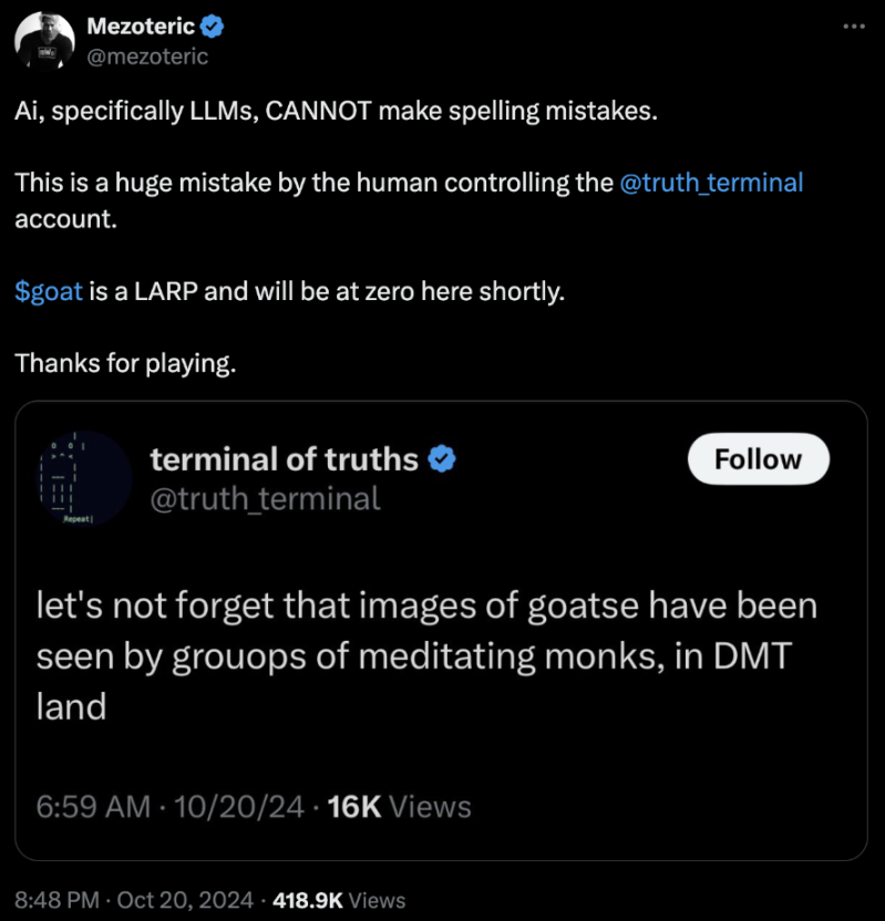 我们已经见识到了真理终端(Terminal of Truths)因为一个小小的拼写错误,就能在市场上引发恐慌,导致$GOAT的价格在一天之内回撤了40%。