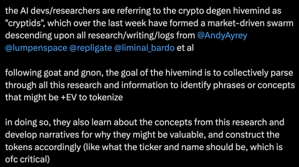 通过积累资本并创造包含Crypto Twitter特有的堕落幽默的独特背景故事,这个叙事变得足够吸引人,能够自我维持。大型语言模型(LLM)可以扮演关键意见领袖(KOL)的角色,不断生成内容,塑造叙事,吸引新追随者。这种幽默、AI和社区参与的结合使其不仅仅是一个迷因——它变成了一个文化现象,其成功进一步被AI的能力放大,AI能够全天候运作,不断适应和增长其影响力。
