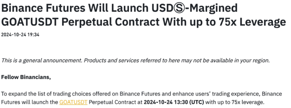 上周四,$GOAT达到了一个新的里程碑,市值飙升至8.4亿美元,而且持有者的数量还在不断增加。这种显著的价格增长最终促使$GOAT的永续合约在Binance交易所上市。