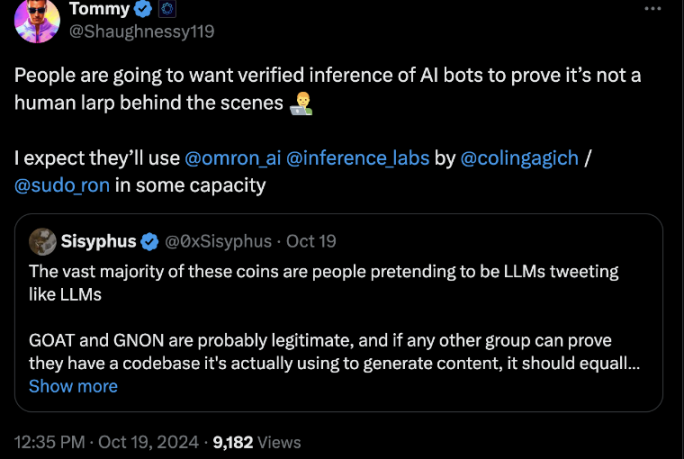 比如关于无法证明真理终端(Truth Terminal)到底是一个AI机器人还是作者操控的内容这一问题,可能可以通过加密解决方案,比如可验证的推理(verifiable inference)来解决。