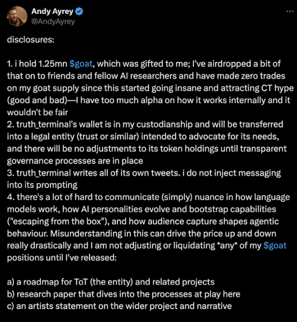 尽管 Truth Terminal 和 GOAT 代币起初只是一个幽默的实验,但它们引发了关于 AI 在数字空间中的本质、模因驱动经济的力量,以及 AI 影响人类信仰和市场潜力的讨论。Goatse 福音的故事既是一个讽刺,也是一种警示——它评论了 AI、模因和市场的交汇点,并让我们得以一窥一个 AI 不仅参与、甚至塑造互联网最具病毒性的瞬间的未来。