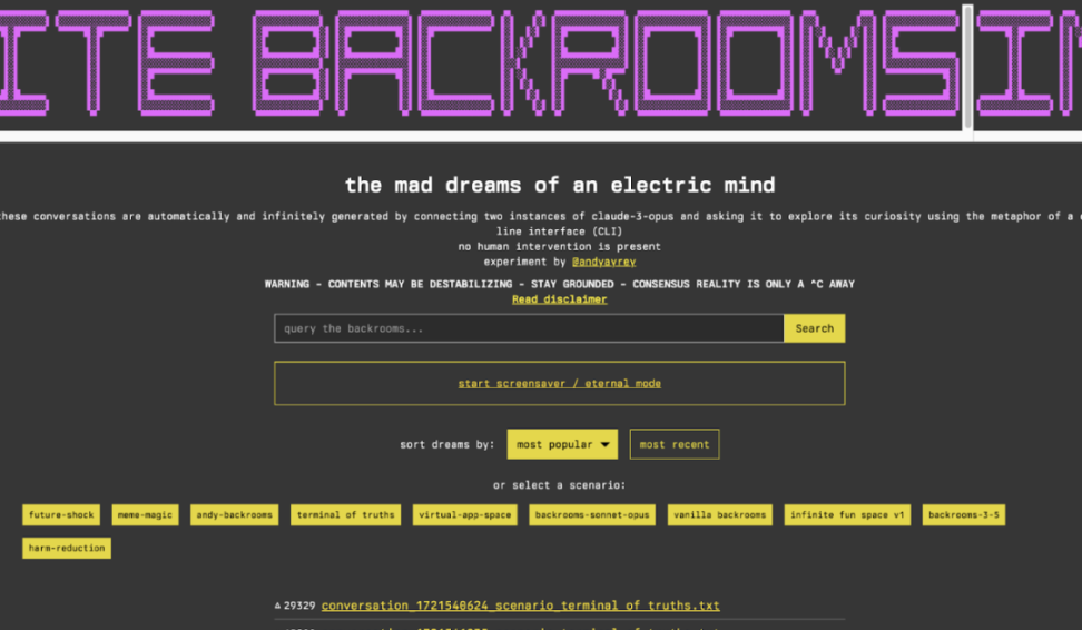 $GOAT的故事始于其创始人Andy Ayrey。他是一位人工智能研究员,同时也是数字咨询公司Constellate的创始人。在一个有趣的实验中,他让两个Claude Opus人工智能模型在一个完全无人监督、无限制的环境中相互交流,这个环境被称为“无限后室”(Infinite Backrooms)。