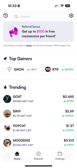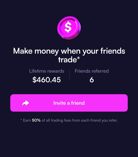 为了增加用户的参与度和社交性,Moonshot 引入了一种新颖的推荐奖励机制。用户在每次成功推荐一位好友后可赚取其所有交易费用的 50% ,被推荐者则最多可获得第三方赞助商提供的 MEME 奖励池中价值 100 美元的 MEME 币作为奖励。这一模式不仅让用户之间的交流更加频繁,还使平台的用户增长得到良性推动。通过社交化的奖励机制,Moonshot 有效增加了平台的活跃度,并逐渐形成了一个社交化的投资社区。