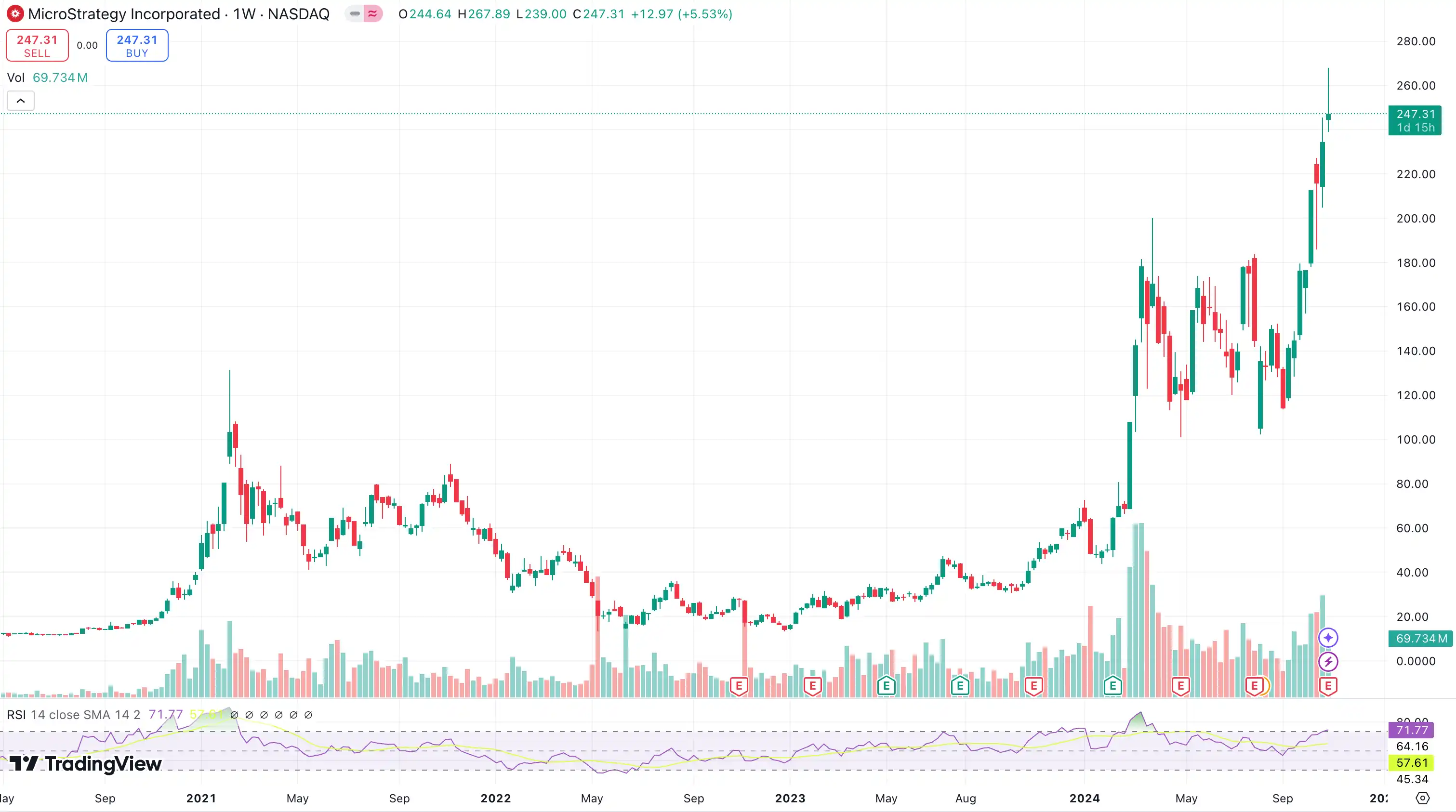 过去几天,美股和加密市场都被 MSTR 亮瞎了眼,在比特币最新一波行情中,MSTR 不仅率先领涨,还在之后的一段时间里对比特币不断保持溢价增长,其价格也从一两周前的 120 美元飙升至当前的 247 美元。