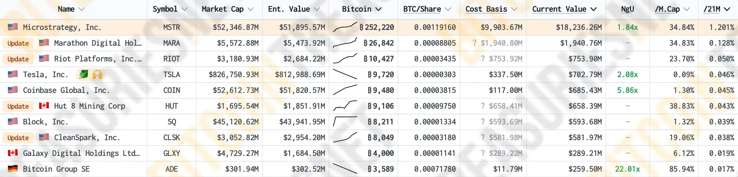 而根据 Bitcoin Treasuries 的数据统计,截至目前,微策略账上已经拥有占总流通供应量 1.2% 的比特币,是全球持有最多比特币的公开上市公司,远超比特币矿企 Marathon、Riot 以及头部加密交易平台 Coinbase 等在业务层面更加「加密原生」的企业。