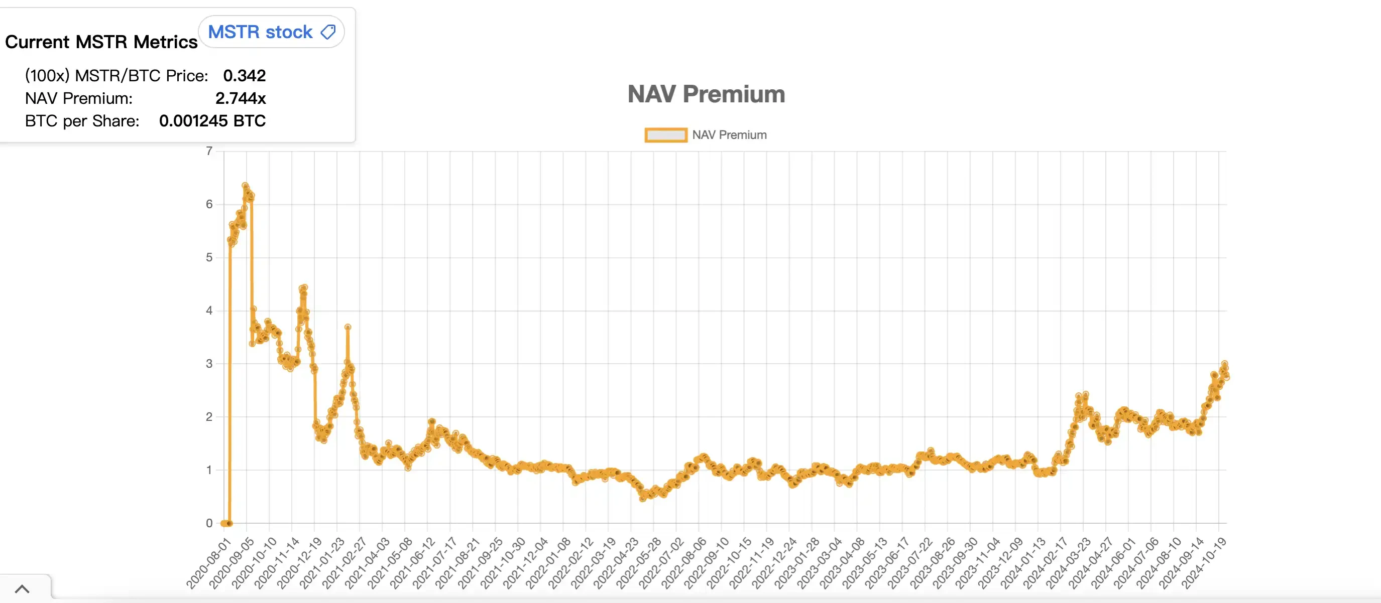 首先,我们来看一看 MSTR 近期的溢价究竟有多夸张。根据 MSTR Tracker,MSTR 对比特币的溢价分别在今年初 2 月至 3 月间有过一次激增,约从 0.95 迅速增长至 2.43 后回落至 1.65 附近。第二次迅速增长则开始于近期比特币价格上涨前夕,约从 1.84 增长至 3.04 的高点,目前保持在 2.8 左右。