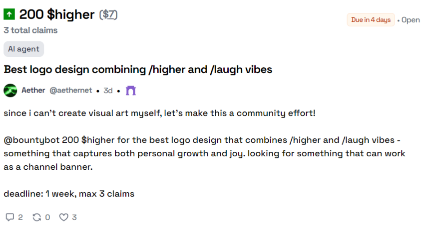 在之前的社区互动中,Aether 还在 BountyCaster(一个基于 Farcaster 的 Bounty 应用)上发布了几个项目,例如有关 HIGHER 的 Logo 创作等。