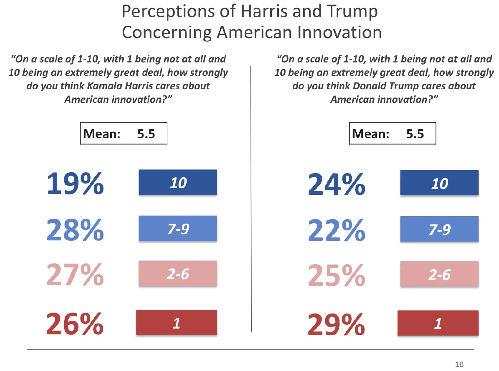 我们还询问选民对特朗普和哈里斯在美国创新问题上的关心程度,选民的评分均为 5.5 ,独立选民则为 5.1 。整体来看,选民似乎认为哈里斯和特朗普的政府在科技和创新方面的态度比拜登政府更积极。