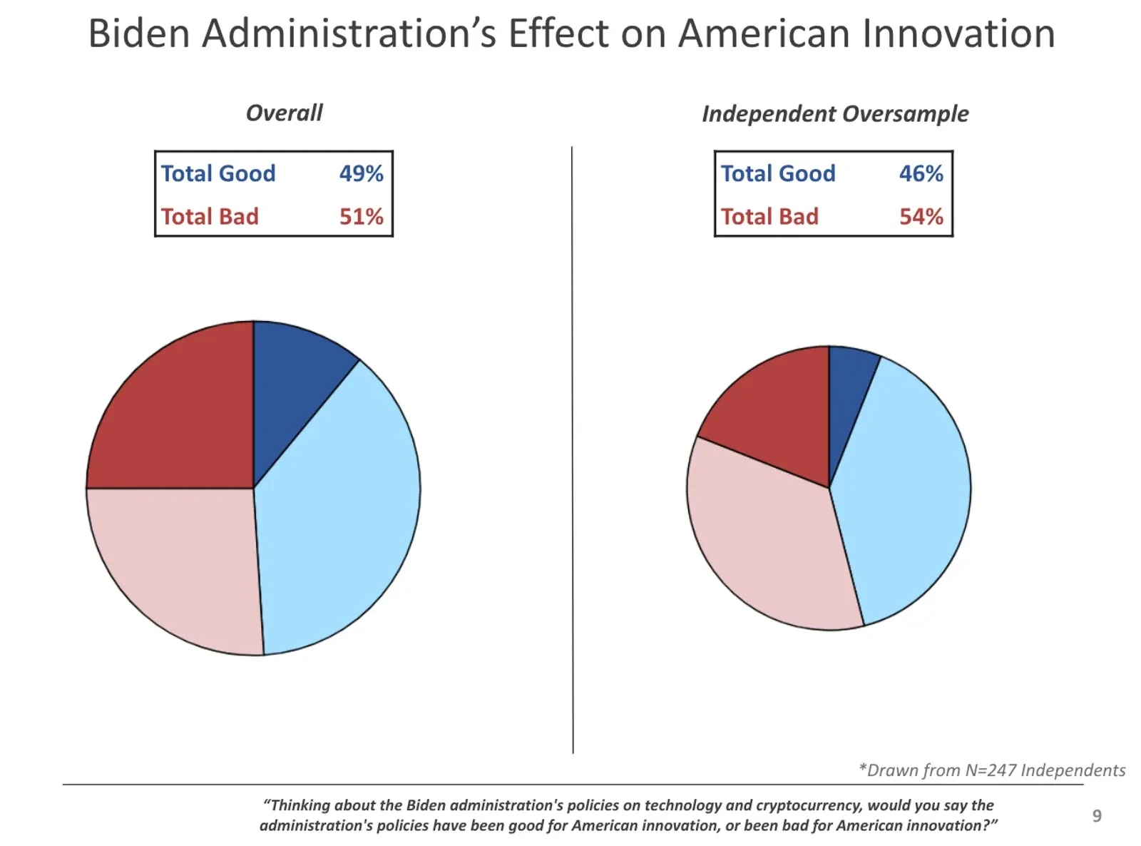 我们询问选民:“考虑到拜登政府在科技和加密货币方面的政策,你认为这些政策对美国创新是好是坏?” 49% 的选民表示政策好,而 51% 表示坏。在独立选民中,负面看法更为明显, 54% 认为非常坏或有些坏。仅有 11% 的选民认为这些政策非常好。