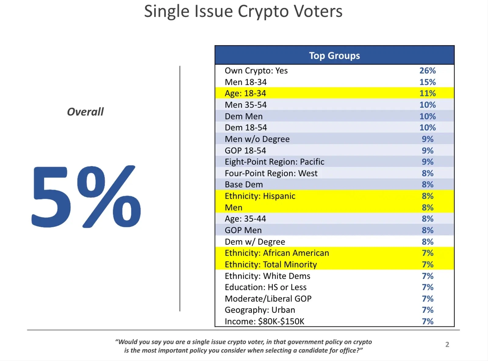 在这组人中,四分之一(即 5% 的全部选民)表示自己是单一议题的加密货币选民。这其中, 11% 的 18-34 岁选民、 8% 的男性和 7% 的非白人选民(包括 7% 的黑人和 8% 的西班牙裔选民)都表示认同。在 关键的摇摆州 ,如宾夕法尼亚、密歇根、威斯康星和乔治亚州,选票差距通常在 1-2 个百分点, 5% 的选民就可能成为胜负的决定因素。