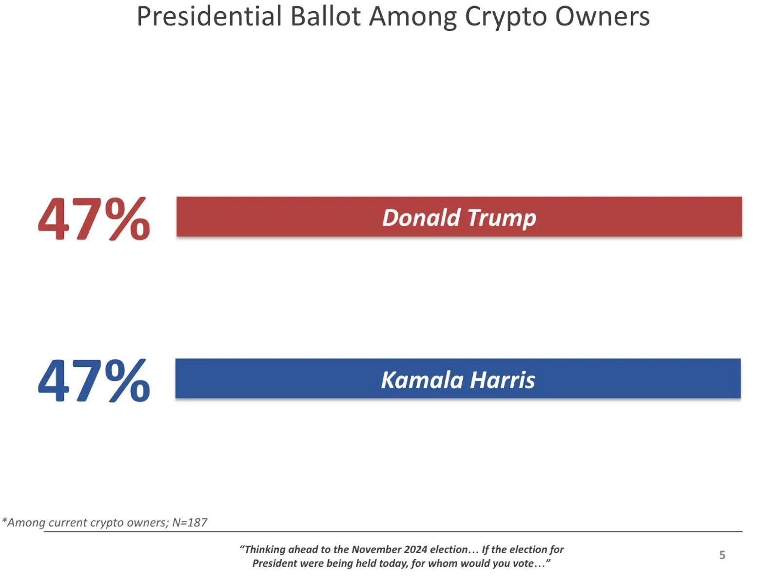 调查结果还揭示了选民对两位主要候选人——卡马拉·哈里斯和唐纳德·特朗普的态度。尽管哈里斯在总体支持率上稍微领先,但在加密货币持有者中,两位候选人的支持率持平。这表明,加密货币持有者的投票意向可能会对选举结果产生重要影响。