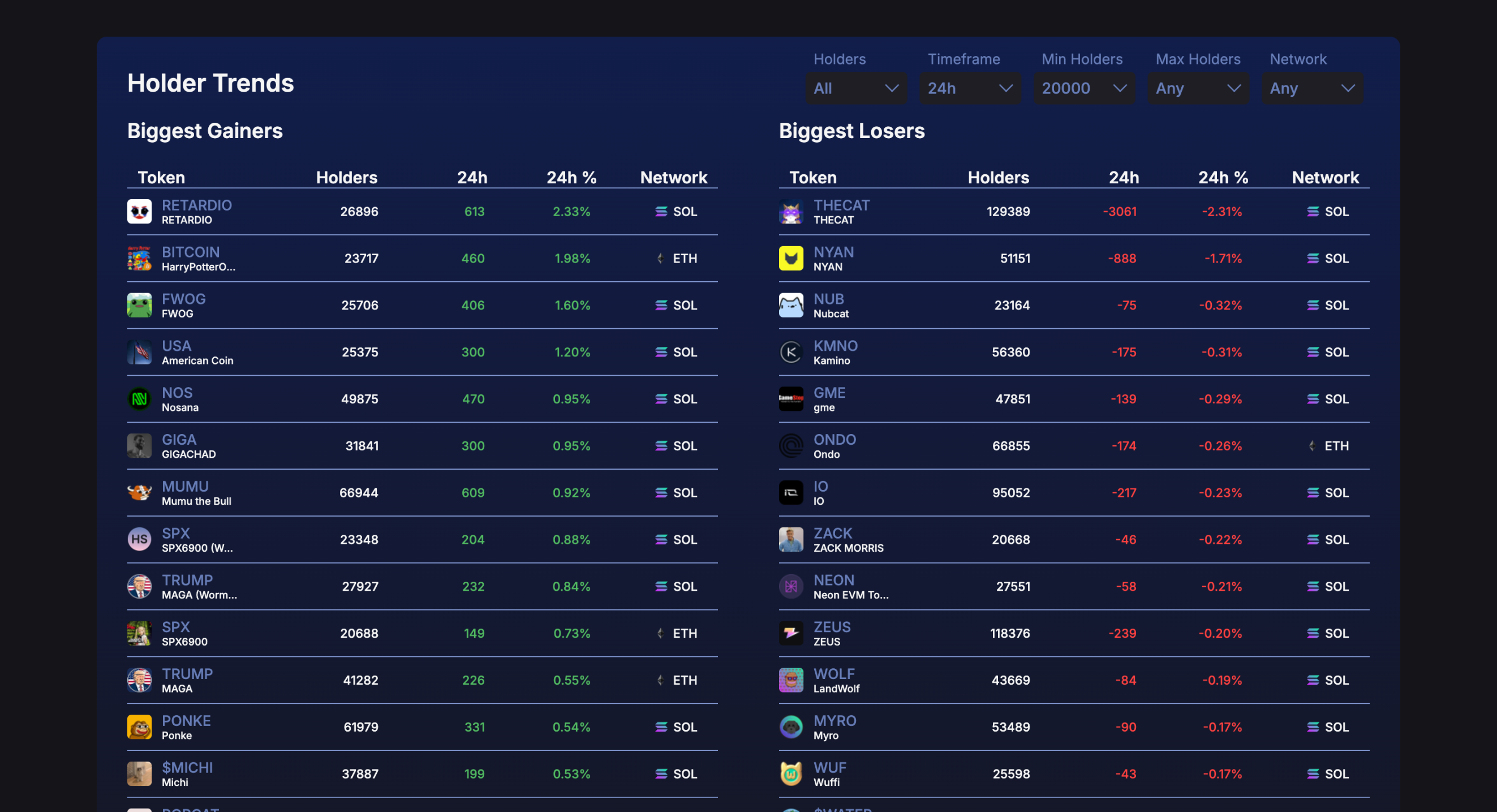Holderscan:一个链上数据平台。可用于探索加密货币代币持有者的实时和历史数据。