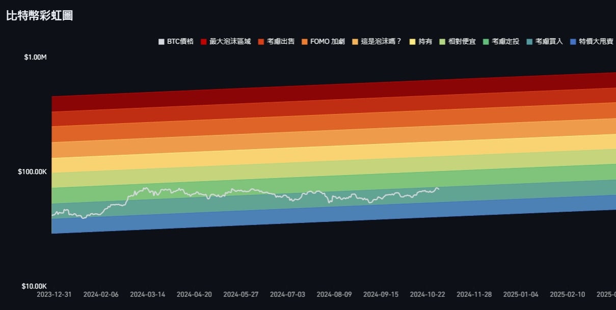 比特币彩虹图 展示 ,比特币当前价格( 7 万美元 )位于「 考虑𧹒入 」至「 考虑定投 」区间。在「 考虑定投 」阶段(7 万美元)与「 特价大甩卖 」阶段(5.2 万美元)之间。