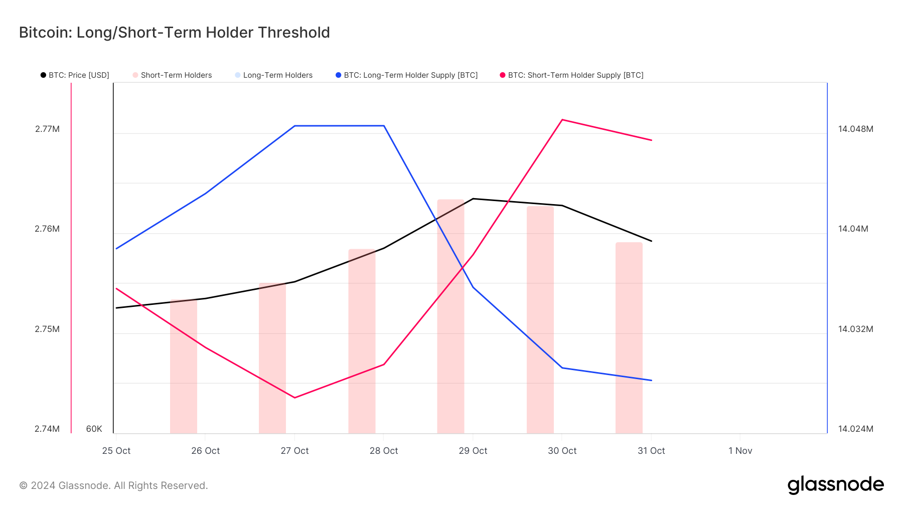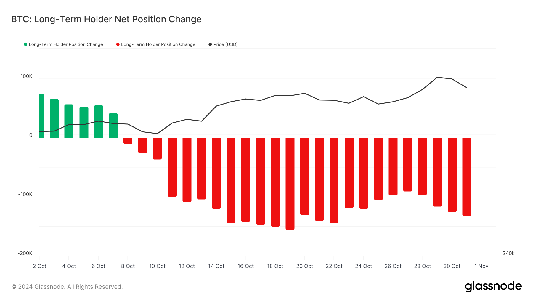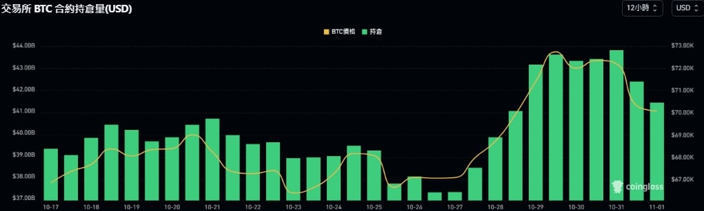 ,自 10 月中旬起,这一净头寸数据逐渐转为负值,并在接下来的几天裡持续下降,暗示长期持有者𫔭始大幅减仓,当前抛售幅度没有进一步的加剧,然而比特币价格突破 7 万美元,期持有者的净头寸减少对市场的短期支撑力构成挑𢧐,若这一趋势持续,市场或将面临一定的下行压力。
