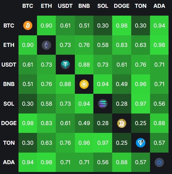 主要代币间的相关性普遍增强,显示市场对于整体趋势的共识更高,尤其是 BTC、ETH 和 DOGE 之间的连动性较强。