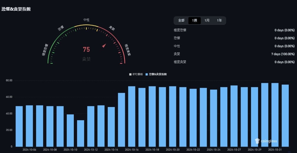 本周的市场情绪 指标 由 74 (贪婪)上升至 75 (贪婪),整周在(贪婪)的区间。