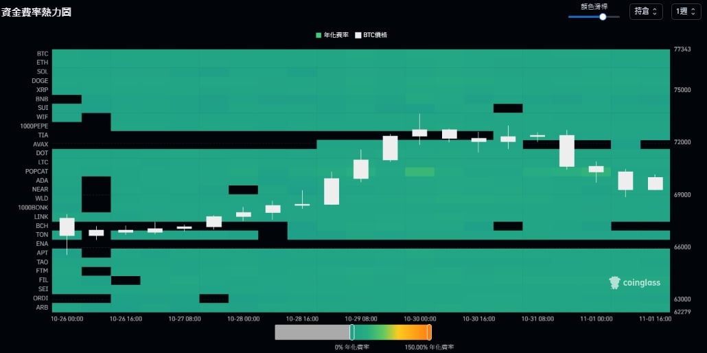 资金费率热力图 展示 了不同加密货币的资金费率变化趋势,颜色从零费率的绿色到 50% 正费率的黄色,黑色则代表负费率;白色 K 缐图则显示比特币价格波动,与资金费率形成对比。