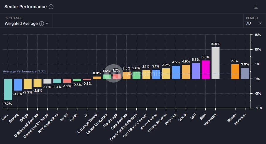 根据 Artemis 数据 显示 ,本周区块链领域板块的平均涨幅为 (1.6 %) ,其中 Memecoin、RWA、DeFi 分别以 (10.9%、6.3%、5.5%) 占据前三。