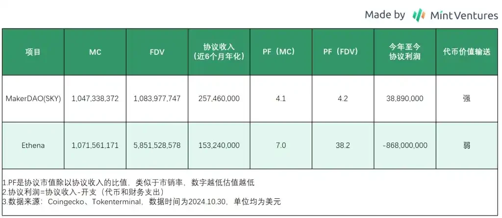 因此,我们将用目前流通市值最大的稳定币项目 MakerDAO(现 SKY)作为估值对标物来进行比较。