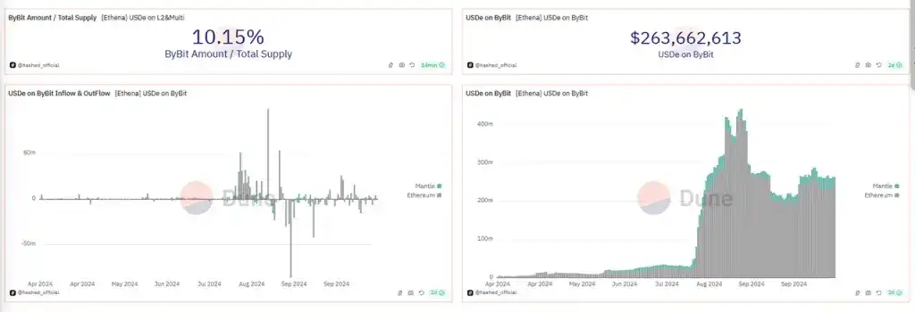 此外,Bybit 作为 Ethena 的投资方和重要合作平台,不但支持 USDE 作为保证金进行衍生品交易,还为存放在 Bybit 的 USDE 提供一度高达 20% 的收益率(9 月降低至最高 10% )。因此 Bybit 也是 USDE 最大的托管方之一,目前拥有 2.63 亿的 USDE(高峰时期超过 4 亿)。