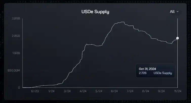 在 2024 年 7 月初 USDE 的发行规模创出 36.1 亿的新高后,其规模持续回落至 10 月中旬的 24.1 亿止跌,目前正在逐渐回升,截止 10 月 31 日约为 27.2 亿。