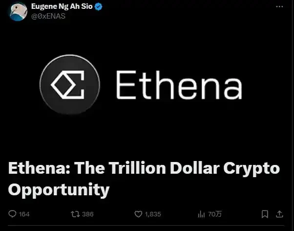 实际上,真正推动这轮 ENA 价格起飞的是知名交易员和加密 KOL Eugene @0x ENAS 在 10 月 12 日发表的对 Ethena 的大力喊单文章: 《Ethena: The Trillion Dollar Crypto Opportunity》 。