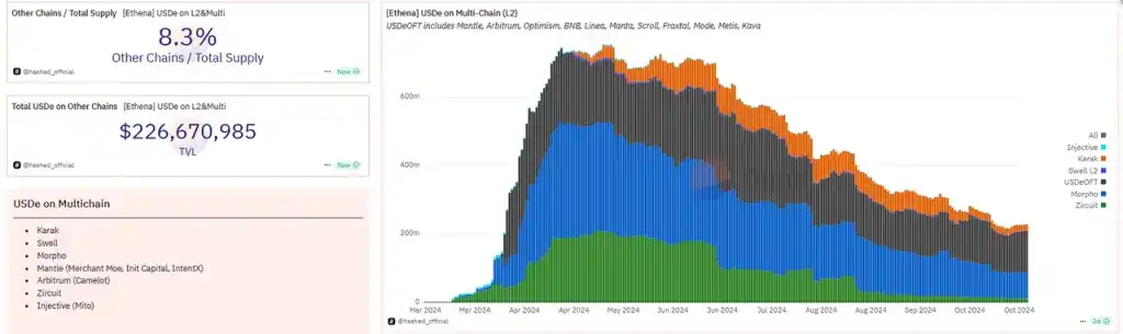 USDE 不但在以太坊主网上进行发行,还在多条 L2 和 L1 上进行拓展,目前在其他链上发行的 USDE 规模为 2.26 亿,约占总量的 8.3% 。