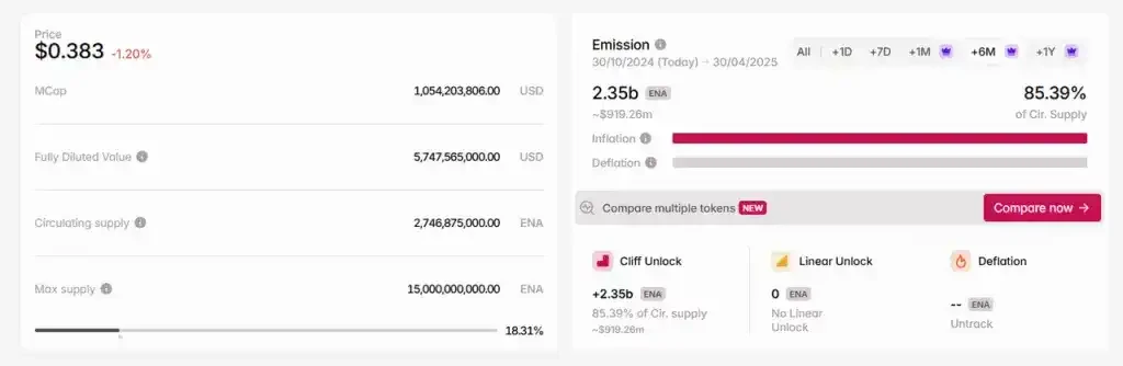 · ENA 未来半年仍然有很大的通胀压力,一方面来自营销活动中 ENA 代币的支出,以及明年 3 月下旬更是面临核心团队和投资者一年到期后的解锁,根据 tokenomist 数据,未来 6 个月 ENA 代币面临现流通量 85.4% 的通胀压力。