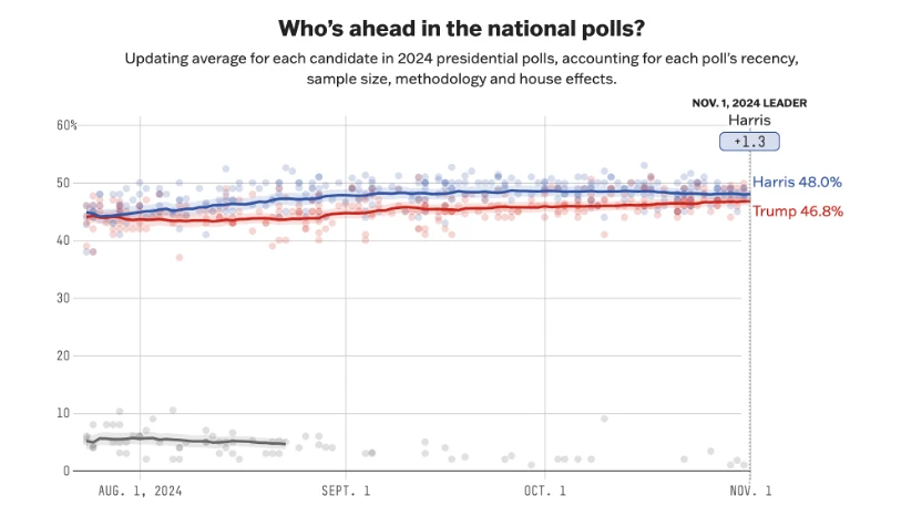 目前,在权威机构预测的大部分民调中, 不管是偏向民主党的媒体、偏向共和党的媒体或者是中立机构, 哈里斯仍然占据优势,但优势仅有一两个百分点。 根据中立媒体 Project 538 的统计,目前的各大民调结果的平均值显示,截止 11 月 1 日,哈里斯胜率为 48.0% ,特朗普胜率为 46.8% 。其他数据统计网站的结果也相差不多,比如纽约时报的结果是哈里斯的 49% 比特朗普的 48% ;270 towin 的结果是哈里斯的 48.4% 对比特朗普的 47.2% 。