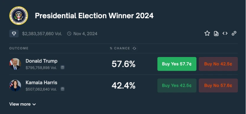 这一结果与加密预测平台代表 Polymarket 目前的结果有些大相径庭;根据Odaily星球日报之前发布的文章 《美国大选临近,Polymarket 的数据更可信吗?》 ,可以看到此前特朗普的胜率稳定在 60% 左右,哈里斯仅有 40% 不到。截止本文发布时,该预测市场金额总计已经达到 23.8 亿美元,特朗普胜率有些许下滑,哈里斯胜率对应有所提升。可以看到,Polymarket 市场在过去一周内正在向民调结果靠近,虽然特朗普仍稳稳占据主要位置。