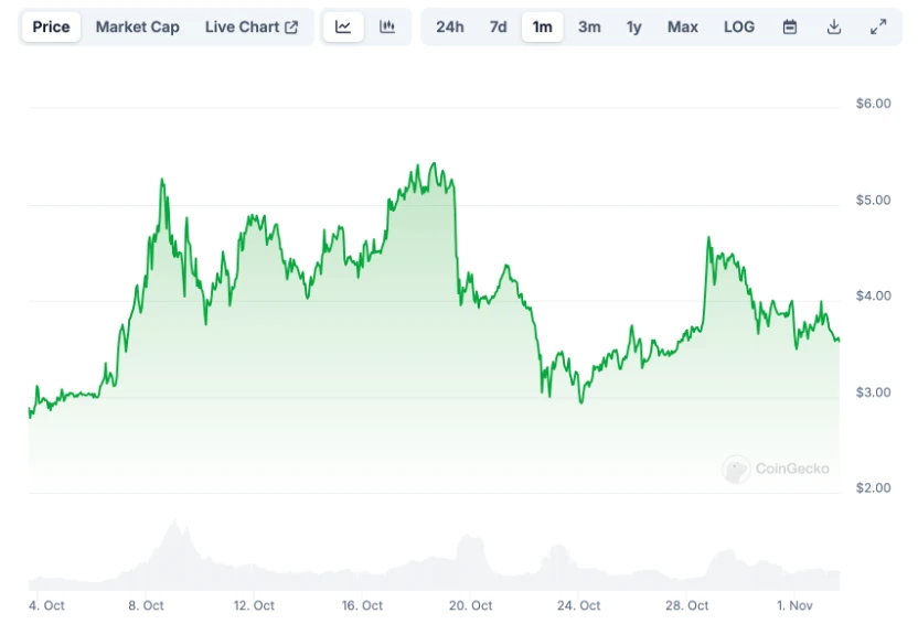 目前,特朗普概念的最大 Meme 币 MAGA 的走势始终维持在 3 美元到 4 美元之间,虽有波动幅度却并不大,似乎是在等待最终选举结果的公布。而这种横盘走势已经持续了大约两周之久。