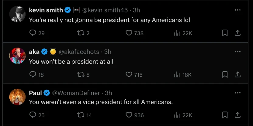 其次,在如今的 X 平台上,争论层出不穷, 候选人哈里斯的推特下面基本上清一色是骂她的帖子。 在她最新的帖子“我将成为所有美国人的总统”下面,评论区几乎是一边倒的:“你不会是任何美国人的总统”,“你根本就不会成为总统”,“你甚至不能算是所有美国人的副总统”,底下的人这么说。