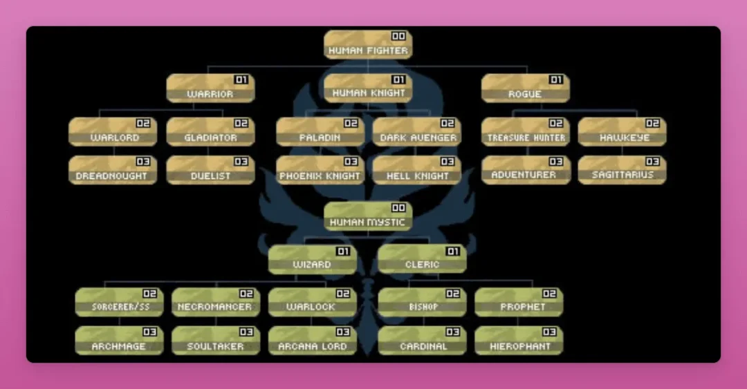 在 天堂 2 中,你可以选择一个种族(人类、精灵、兽人等)和职业(𢧐士、神秘主义者)。