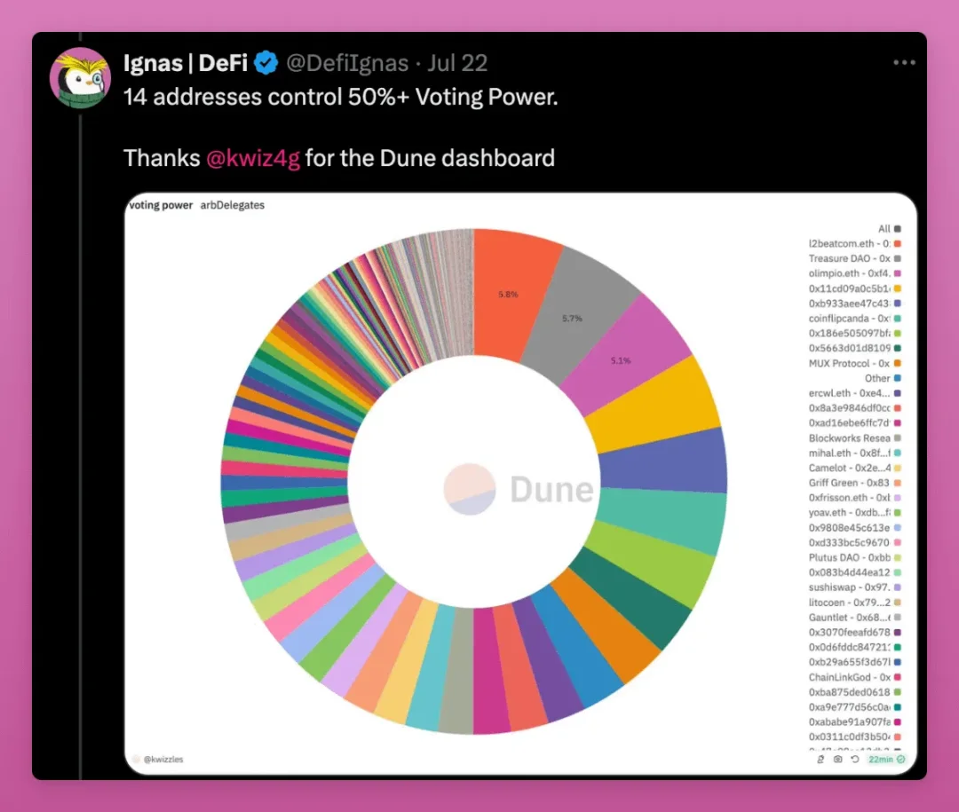 DAO 倡导去中心化组织的𫖸景,但现在大多数 DAO 都远未实现去中心化,这已是公𫔭的秘密。例如,在 Arbitrum DAO 中,14 个地址控制著超过 50% 的投票权,其他 DAO 也一样。