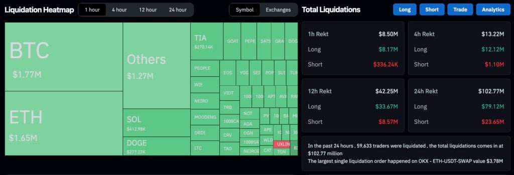 比特币震盪的行情中,据 Coinglass 数据 显示,过去 24 小时,加密货币全网爆仓金额超过 1 亿美元(多头占 7912 万美元),有近 6 万人遭清算。