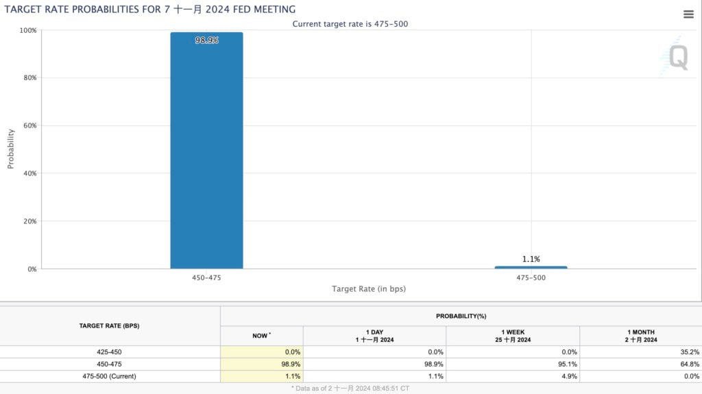 据芝商所 Fed Watch 工具 显示,目前市场认为本月降息 1 码的机率已经攀升至 98.9%,仅 1.1 % 人认为 Fed 将继续维持利率不变。