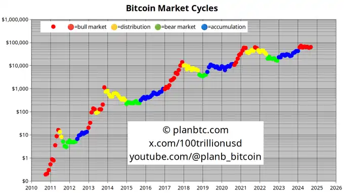 10 月:经典暴涨月,BTC 达到 70, 000 美元。 PlanB 预测,比特币价格将在 10 月迎来一轮强劲上涨。他认为比特币的暴涨可能会被全球市场波动性加剧和投资者信心的恢复所驱动,这也是比特币在历史上多次表现出价格暴涨的时点。