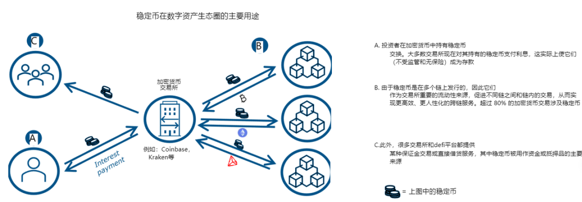 当今市场上最流行的稳定币是法币支持稳定币,该抵押品的很大一部分采用国债和财政部支持的回购交易的形式。我们估计总共 1200 亿美元的稳定币抵押品直接投资于国债。短期内,我们预计稳定币市场以及数字资产市场的整体规模将持续增长,中期监管和政策选择将决定这种「私人货币」的命运。历史表明,不符合国家质量保证要求的 「私人货币」会导致金融不稳定,因此极不可取。
