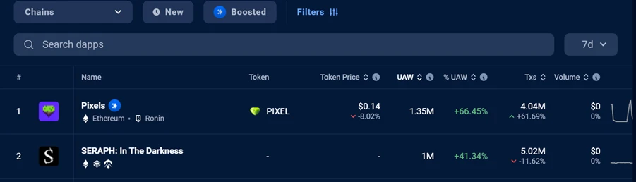 《SERAPH: In the Darkness》是一款暗黑魔幻风格,基于 NFT 的动作类 ARPG Web3游戏。自 2023 年 11 月游戏正式上链开启正式赛季以来,SERAPH 人气持续火爆。根据 DappRadar 数据,SERAPH 过去 7 天 UAW (Unique Active Wallets)超过 1 M,成为#GameFi 赛道第二。Txns 数据也随之水涨船高。作为第二代链游的代表,SERAPH 自 2023 年 4 月 Alpha 测试取得 10, 000+注册的优异成绩以来, 5 次测试数据屡创新高:S 0 赛季(第 5 次测试)平均 DAU 达到 15, 000 , 14 天留存率超 30% ,并取得数百万美元的收入,成为 ARPG 赛道中的一匹黑马。