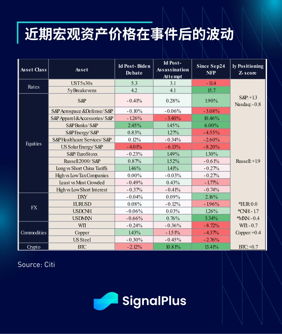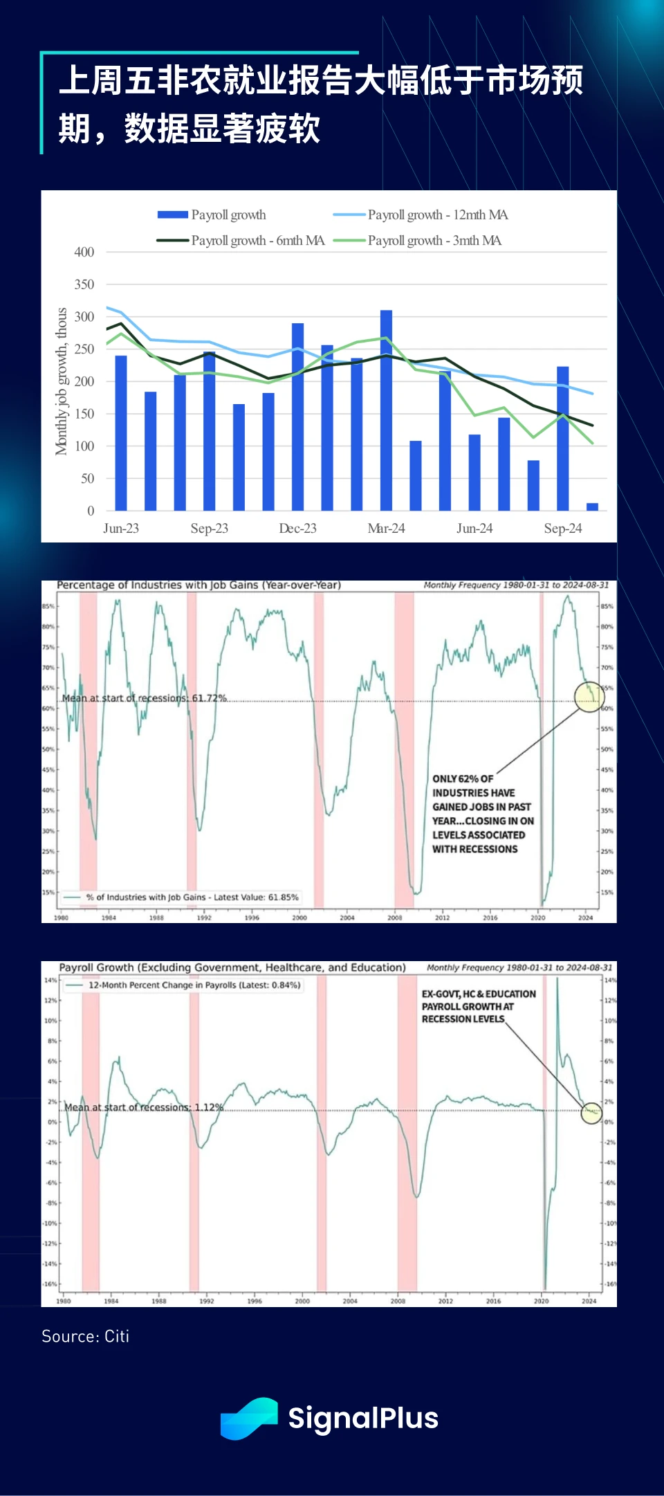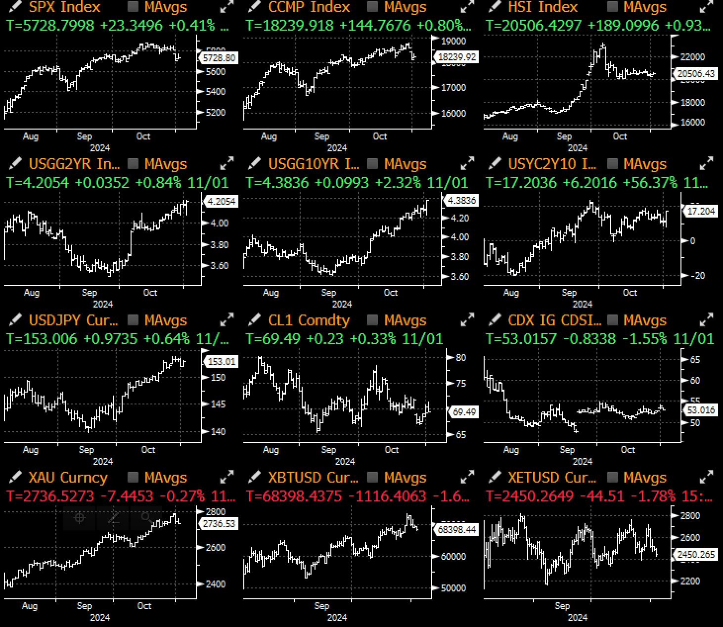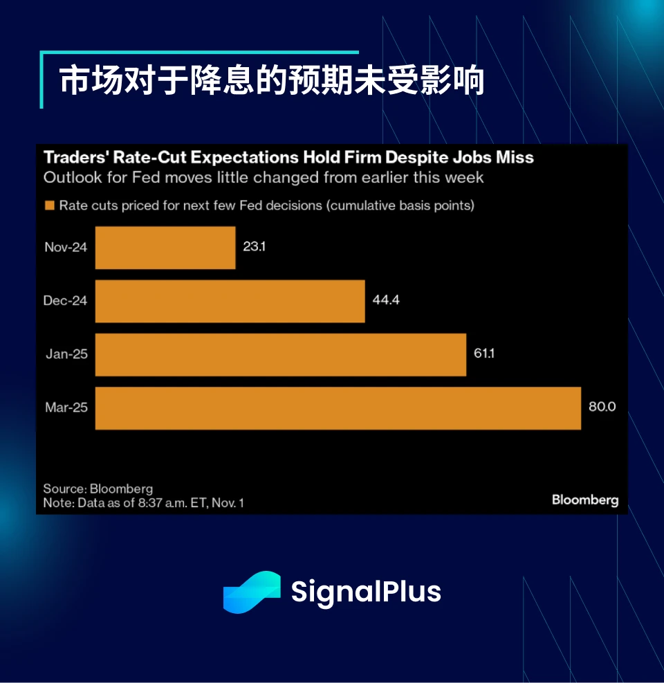 尽管数据大幅低于预期,但市场在美国大选前并未受到影响。美债收益率在非农就业数据公布后虽然下意识反应,不过最终逆转回升,收益率曲线收盘上升 4-10 个基点, 10 年期收益率接近 4.40% ,债券交易员仍在对 Trump 胜选的可能性进行对冲。股市方面,尽管当天动能股、小型股和高 beta 股表现不佳,但股市仍小幅上涨,而美元兑英镑(英国预算问题)和日圆(套利交易)则显著走强。