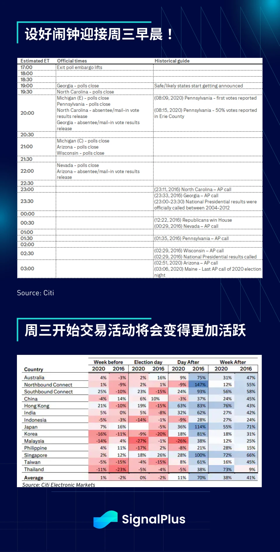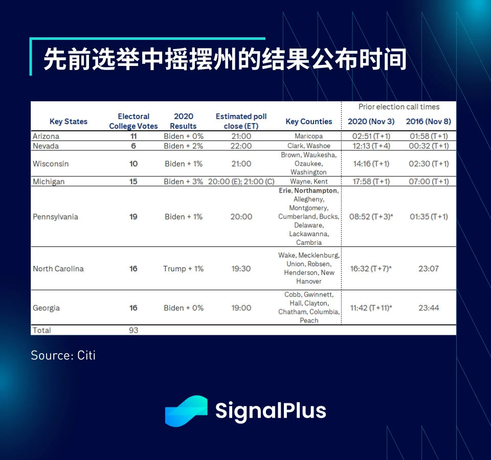 无论如何,由于纽约和加州可能会出现延迟,我们预计总统选举结果会比众议院的更早公布,如果共和党大获全胜,会显著提振风险市场,但我们可能要等到本周末才能得到清晰的结果。