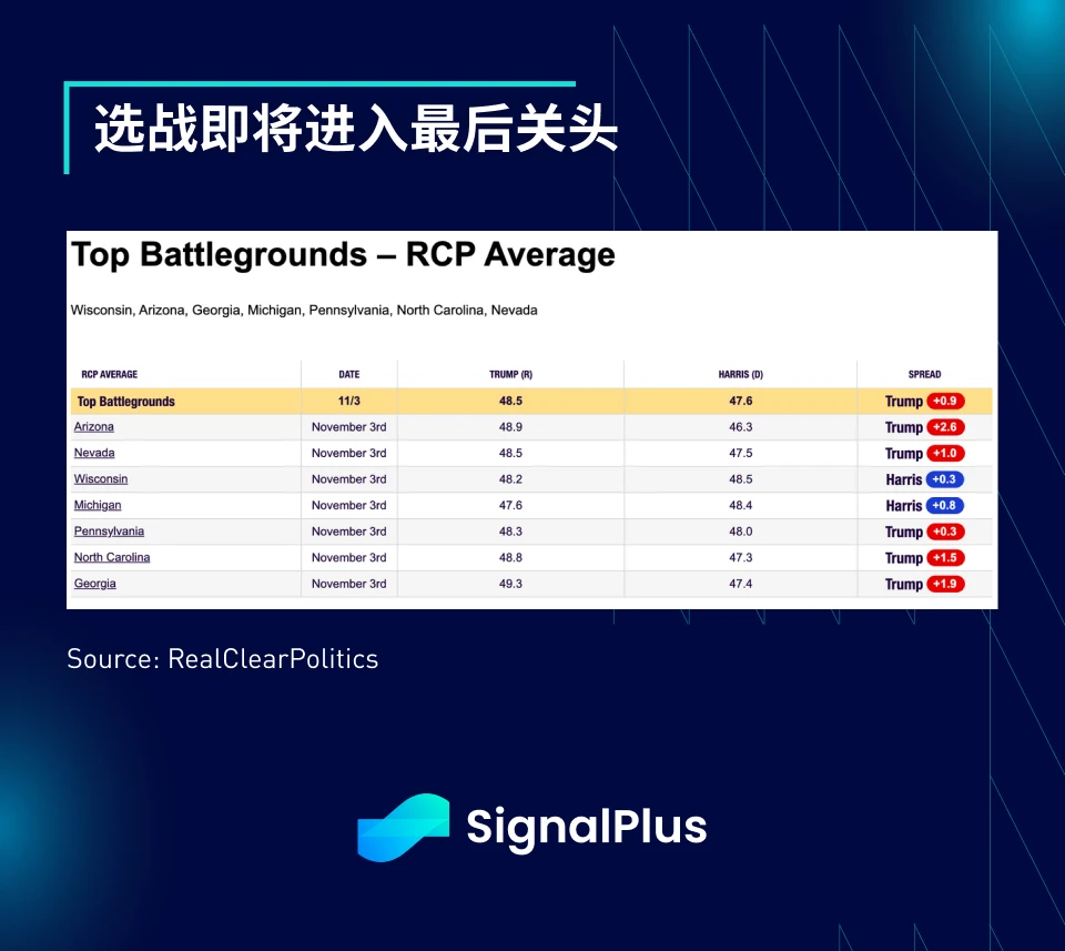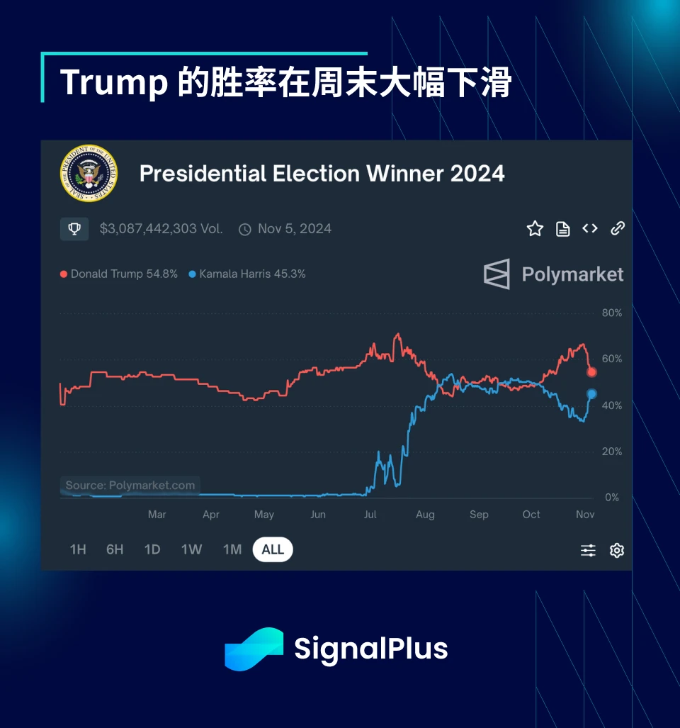 经过激烈而动荡的竞选活动后,期待已久的大选终于到来,各类宏观资产都在高度关注(或许是过度关注)最后的民调波动,其中 Polymarkets 的 Trump 胜率从 67% 大幅下降至 55% ,与其他主流民调一致,目前呈现 50-50 的胶著状态。