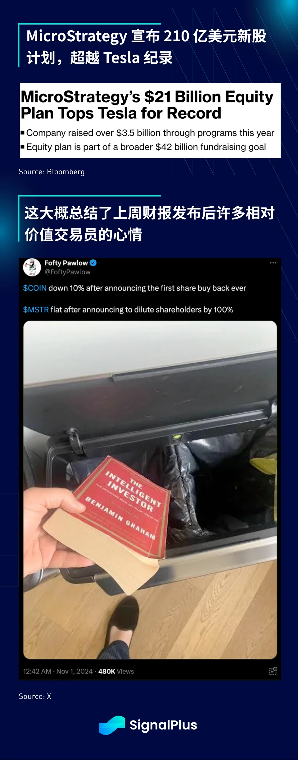 雪上加霜的是,Michael Saylor 最近宣布了 210 亿美元的新股发行,为购买更多的 BTC 提供资金,计划在未来 3 年内继续购入高达 420 亿美元的 BTC。尽管此举会造成股权大幅稀释,但 Microstrategy 的股价仍保持稳定,而其他加密货币标的的表现则相对疲软,Coinbase 在财报公布后下跌了 10% 。也许在宏观和政治结果上进行投机比在单一个股上更加容易!