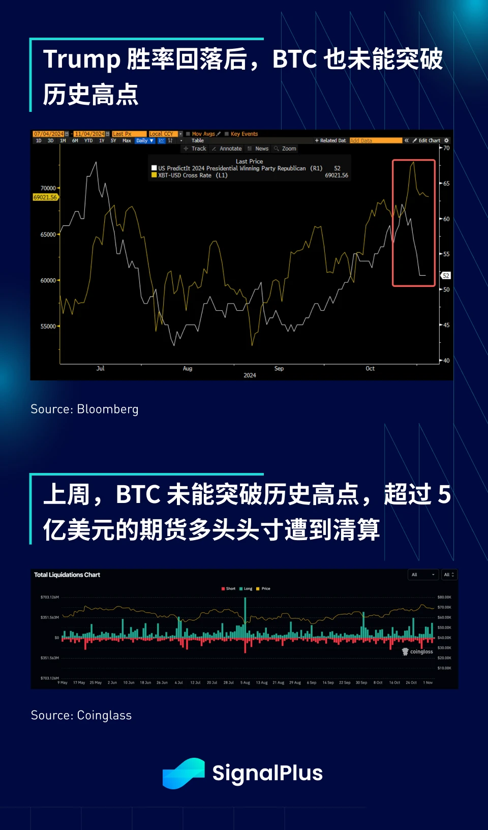 最后,在加密货币方面,BTC 原先距离历史高点仅一步之遥,然而随著 Trump 胜率回落,BTC 价格也跌至 7 万美元以下。根据 Coinglass 的数据,BTC 未能突破历史高点,有超过 5 亿美元的期货多头头寸遭到清算。高点近在咫尺,却又遥不可及。
