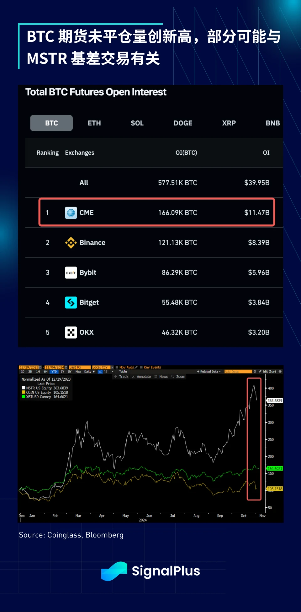 过去一个月,BTC 期货和期权的未平仓量一直在稳步攀升,特别是在芝加哥商品交易所 (CME)。虽然主流对加密货币的兴趣提升也有所帮助,但部分原因可能是对冲基金对 Microstrategy 的基差交易,对冲基金可能在 BTC 期货多头与 MSTR 股票空头之间进行基差交易,MSTR 股价今年以来上涨超过 250% ,而 BTC 上涨了 65% ,Coinbase 仅上涨了 5% 。至于为什么 TradFi 投资者选择这个标的而不是现货 ETF 或者其他挖矿企业,目前我们也没有明确答案。