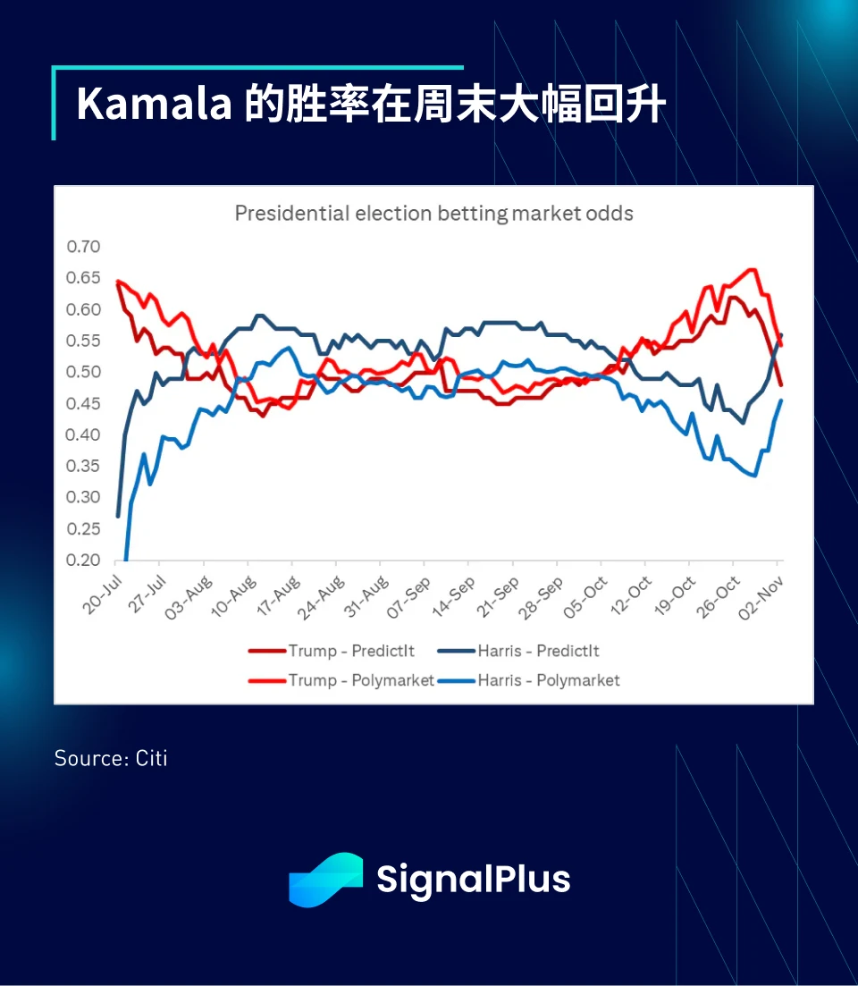 回到选举,随著 Kamala 在最后关头支持率上升,民调几乎已经回到势均力敌的状态,不过实际的市场头寸可能仍倾向于 Trump 胜选。与近期大多数选举结果相比,这次的市场反应可能会是两个极端,Trump 胜选可能会推动收益率上升、美元走强、加密货币上涨,而 Kamala 胜选则会导致相反的结果。然而,无论谁胜出,我们也认为市场可能高估了胜选的短期影响,一旦尘埃落定,市场将进行大量重新校准并转而关注更基本的主题。