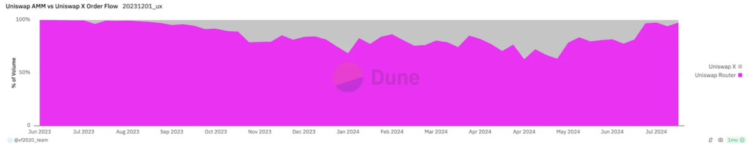 过去几个月,DEX 的格局向基于意图的协议转变,将链上和链下流动性统一起来,使得交易者可以获得更好的用户体验和更低的价格。这些协议引入了市场做市商、搜索者、求解器以及其他角色,这些角色从 DEX 的前端获取报价,并接入包括 CEX 在内的任何流动性来源。在 Uniswap 推出 UniswapX 并默认启用前端后,Uniswap 成为了意图协议对 AMM 流动性影响的重要参与者。