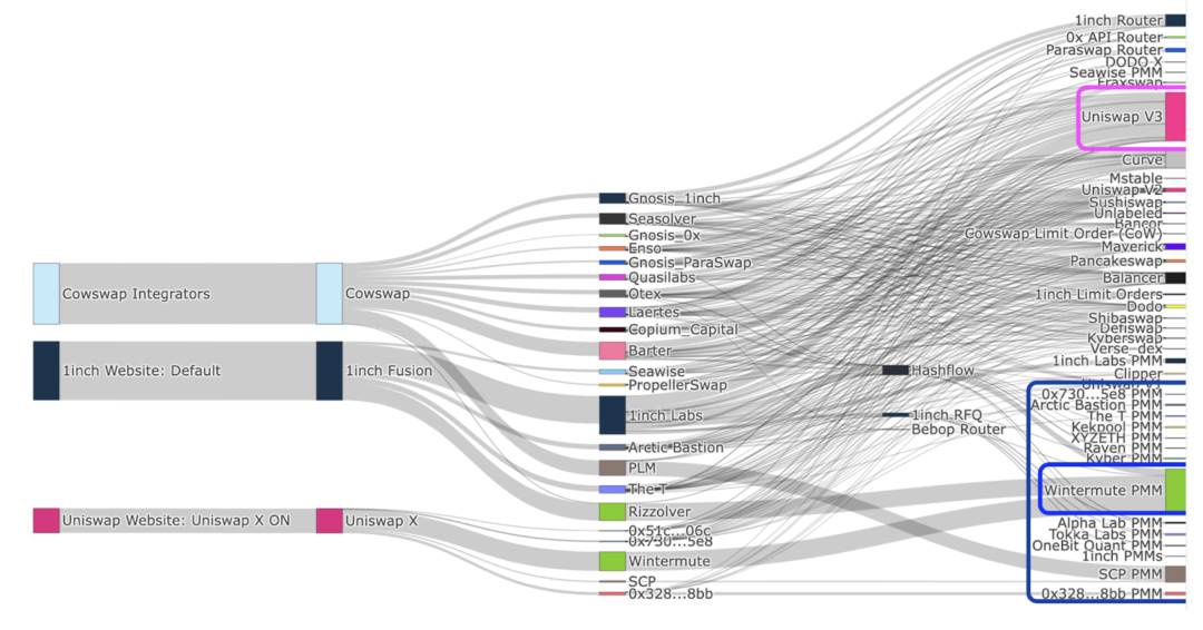 大约 60-80% 的 Uniswap Labs 前端的总周交易量由 AMM 填充。而从单笔交易来看,基于意图的系统目前约占所有 DeFi 交易量的 30% 。自 2022 年初以来,目前约占 DeFi 交易量的 30% 。PMM 占据了意图驱动订单流的绝大部分,Wintermute 占据主导地位,自 2023 年 9 月以来,Wintermute 一直占据着由 PMM 促成的意图驱动流的至少 50% 。