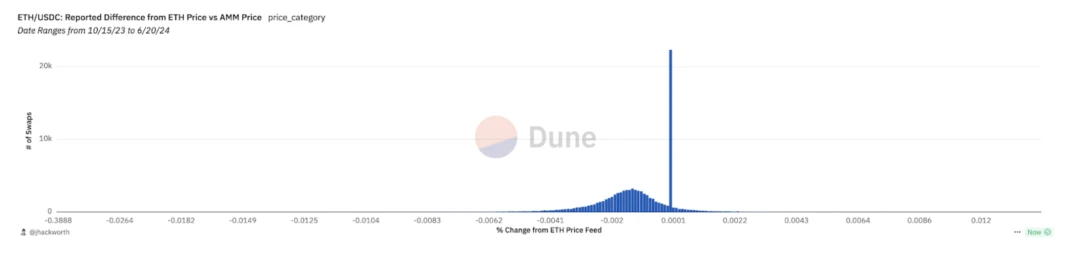 在 Variant 对于 Uniswap X 的观察中可以发现这点。下图显示了从 Uniswap 前端路由至 AMM 的交易中,DEX 报价与使用 CEX API 估算的市场价格之间的差异,路由至 AMM 的流动性平均低于市场价。这意味着流量流向 AMM 的原因在于 LP 提供了更优的过期价格。
