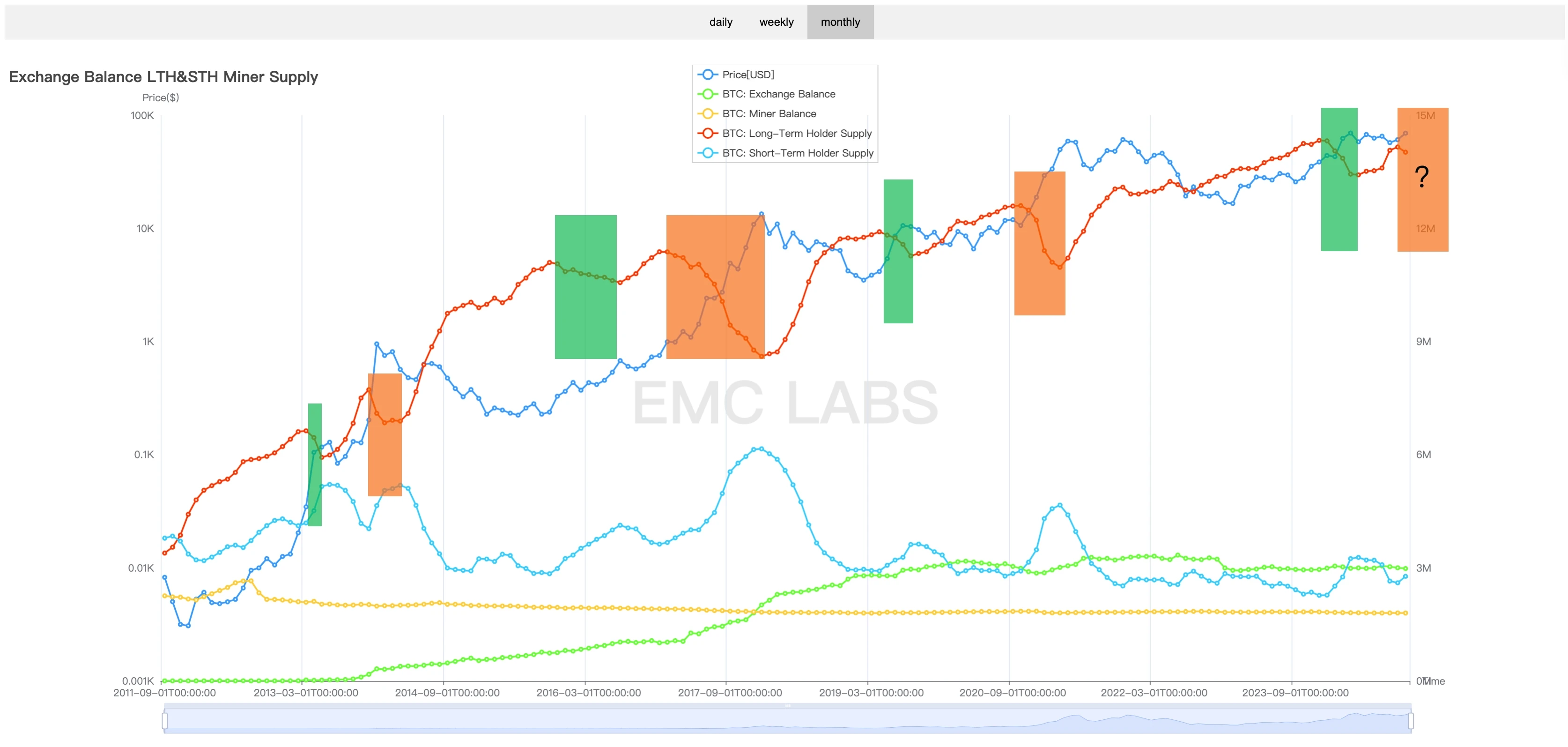 在月线走势图上,可以发现 8 月以来,BTC 的低点价格在持续走高。这一转折的发生基于两点:美联储、欧盟和中国降息以来,全球流动性的持续改善以及加密资产内部调整即持币结构“由短入长”的告结。